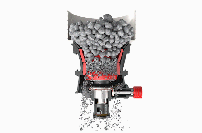 單缸圓錐破碎機(jī)工作時,電機(jī)帶動破碎機(jī)的小齒輪,小齒輪帶動大齒輪,大齒輪組件帶動偏心套組件和主軸組件以理論垂直線為中心,在銅襯套內(nèi)公轉(zhuǎn),主軸組件在偏心銅套內(nèi)以主軸的中心線可以實(shí)現(xiàn)自轉(zhuǎn)。當(dāng)物料加入到破碎腔后,主軸總成在物料的阻力下在偏心銅套內(nèi)緩慢的自轉(zhuǎn)。內(nèi)錐的運(yùn)行軌跡看起來是在破碎腔內(nèi)來回擺動,同時緩慢的旋轉(zhuǎn)。物料被擺動的內(nèi)錐擠壓破碎,破碎出的物料從而排料口排出。